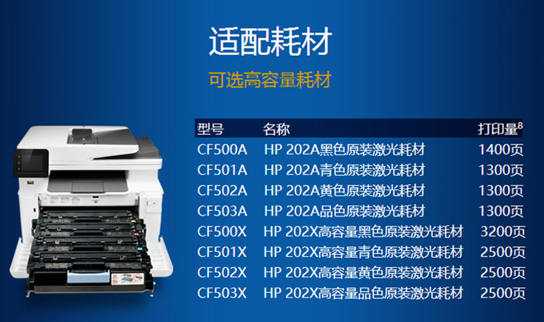 适用耗材型号 | HP 202A硒鼓:黑色CF500A:约1400页,青色CF501A/黄色CF502A/品红色CF503A:约1300页;HP 202X硒鼓:黑色CF500X:约3200页,青色CF501X/黄色CF502X/品红色CF503X:约2500页 |
