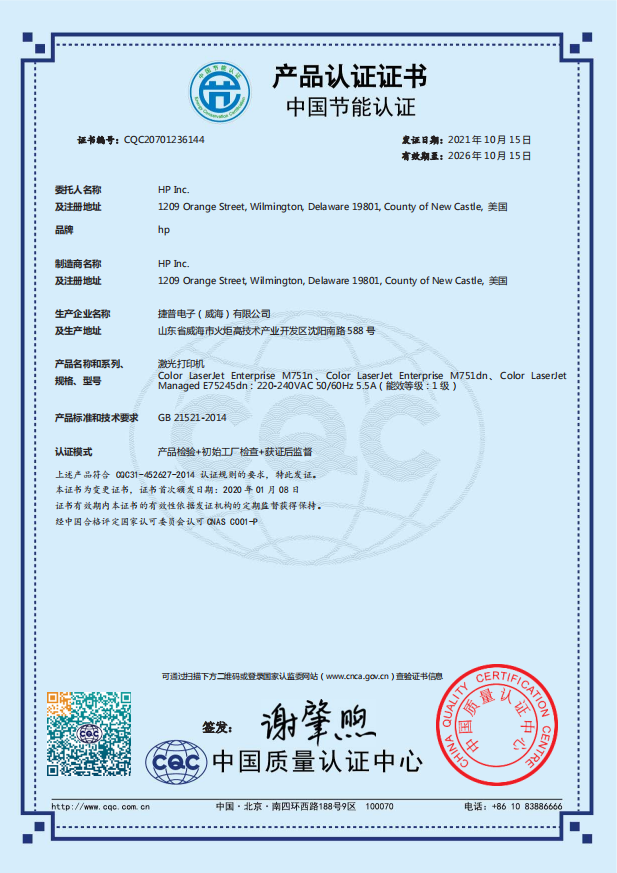 | 认证型号 | Color LaserJet Enterprise M751dn |